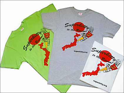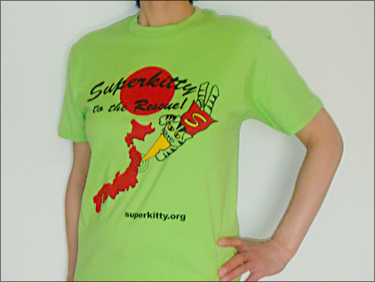 Here are the Superkitty T-shirts! 100% of the profits are donated to JEARS, so you can have a great T-shirt and make a small contribution at the same time. I have adult and kids sizes. Shirts cost $20 dollars per T-shirt within the US, or ¥2000 for an order from Japan.